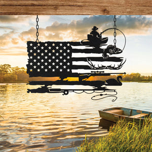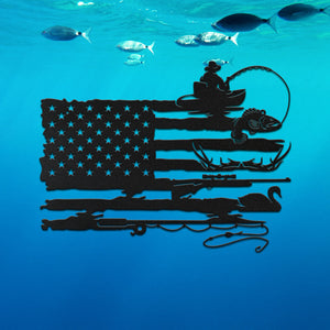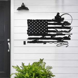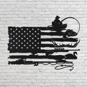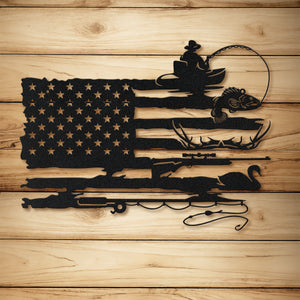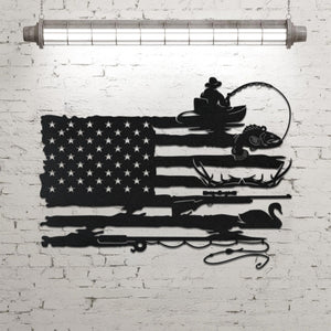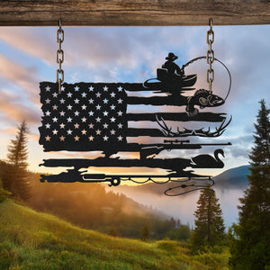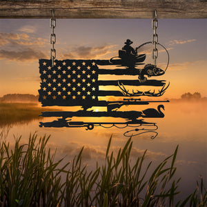 American Fishing, Hunting Sign, Fishing Flag, Gift for Hunters, Metal Name Signs, Rustic Cabin Decor, Man Cave Decor