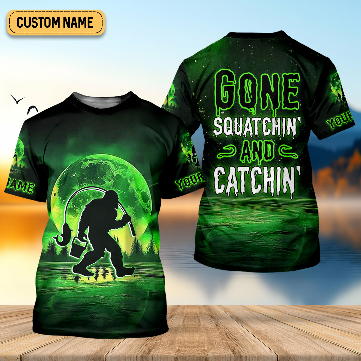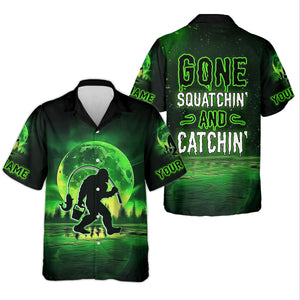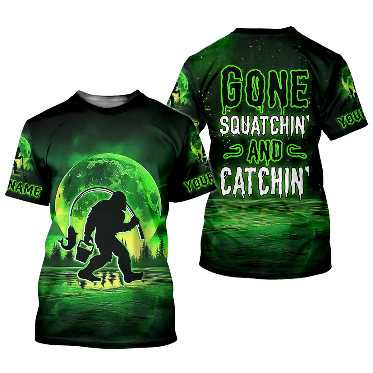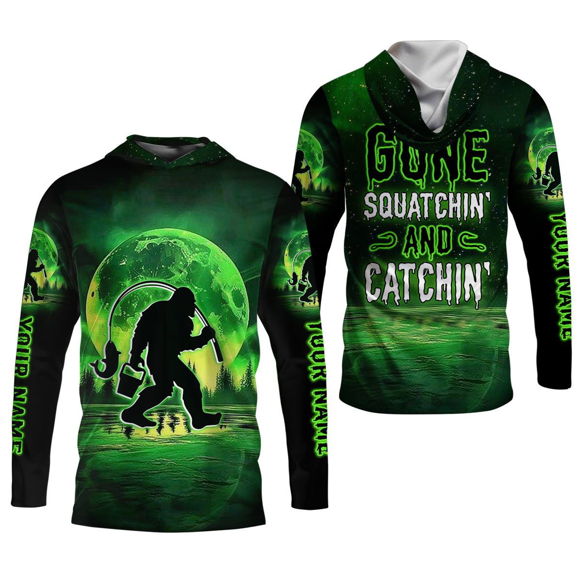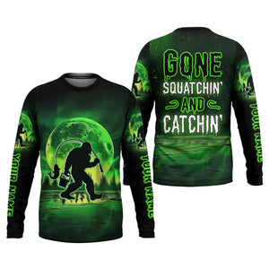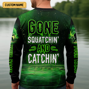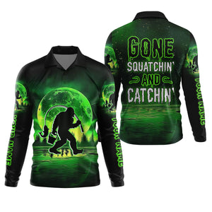 Gone Squatchin And Catchin Bigfoot Neon Green Color Funny Fishing Shirt, SPF Shirt For Men, Presents For Fishermen
