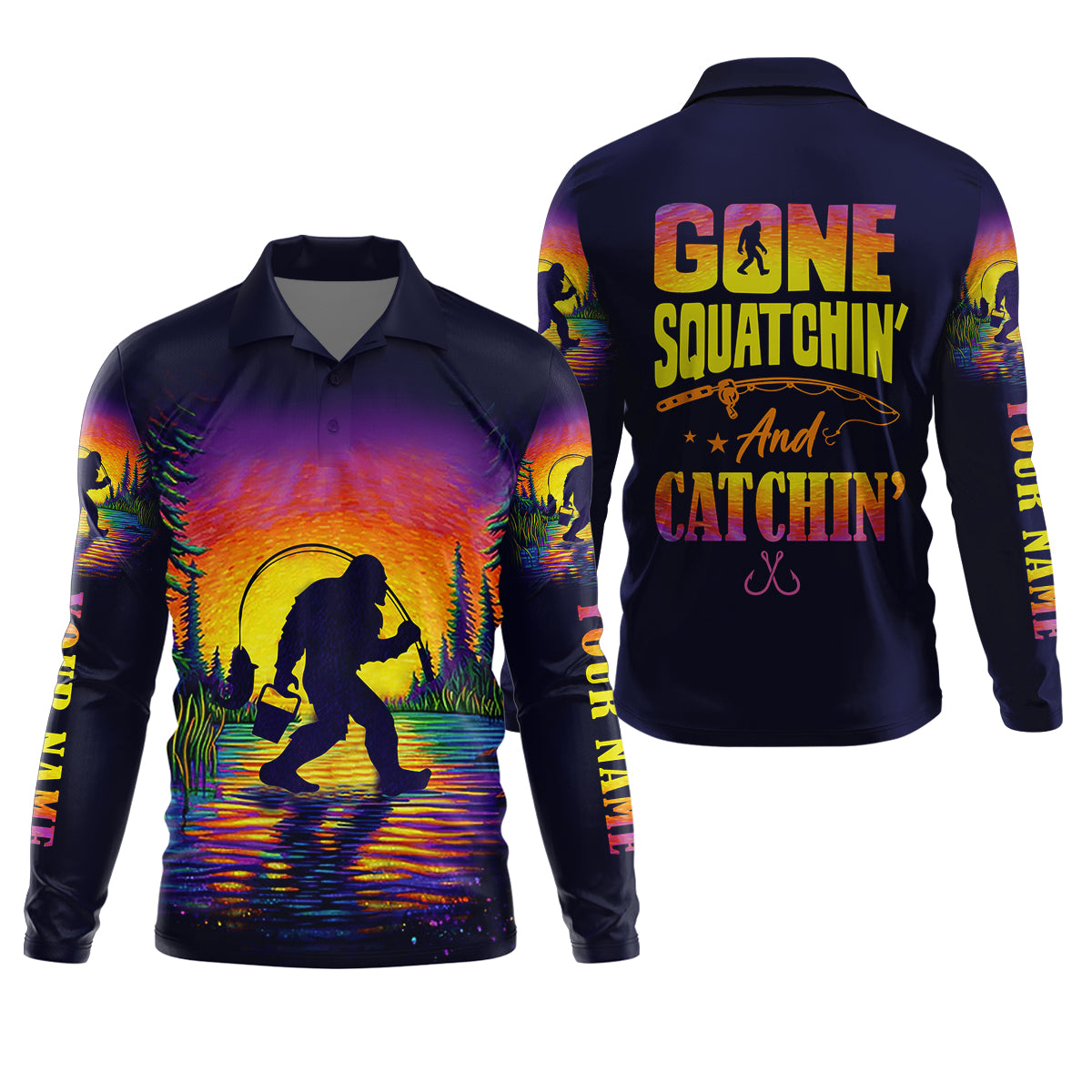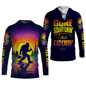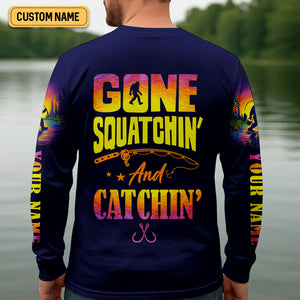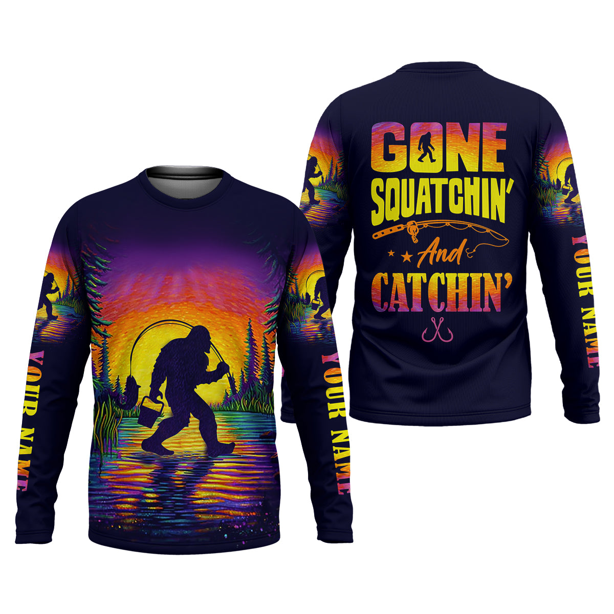 Gone Squatchin And Catching Sunset Fishing UPF Shirts, Funny Fishing Shirt, Sasquatch Fishing Shirts For Men
