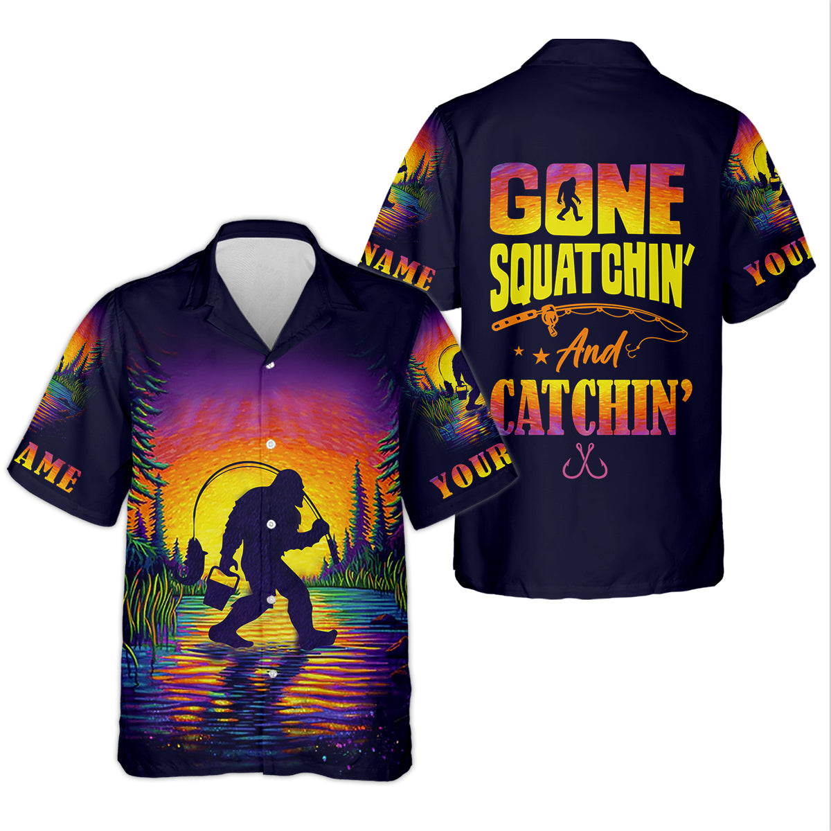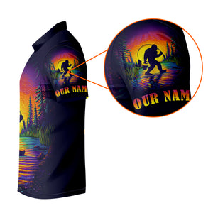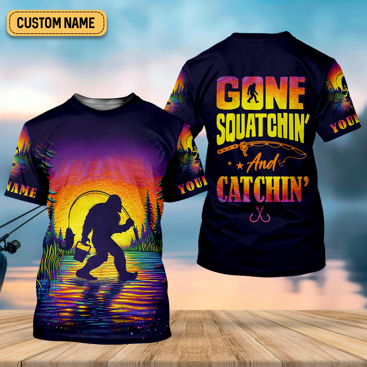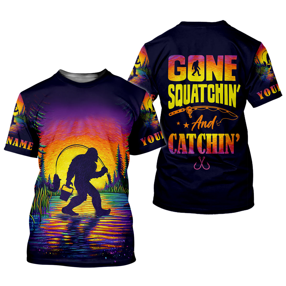 Gone Squatchin And Catching Sunset Fishing UPF Shirts, Funny Fishing Shirt, Sasquatch Fishing Shirts For Men