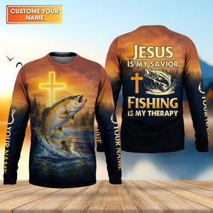 Jesus Is My Savior Fishing Is My Therapy Shirt, Custom Name Fishing Shirt, Fishing UPF Shirts, Funny Fishing Shirt