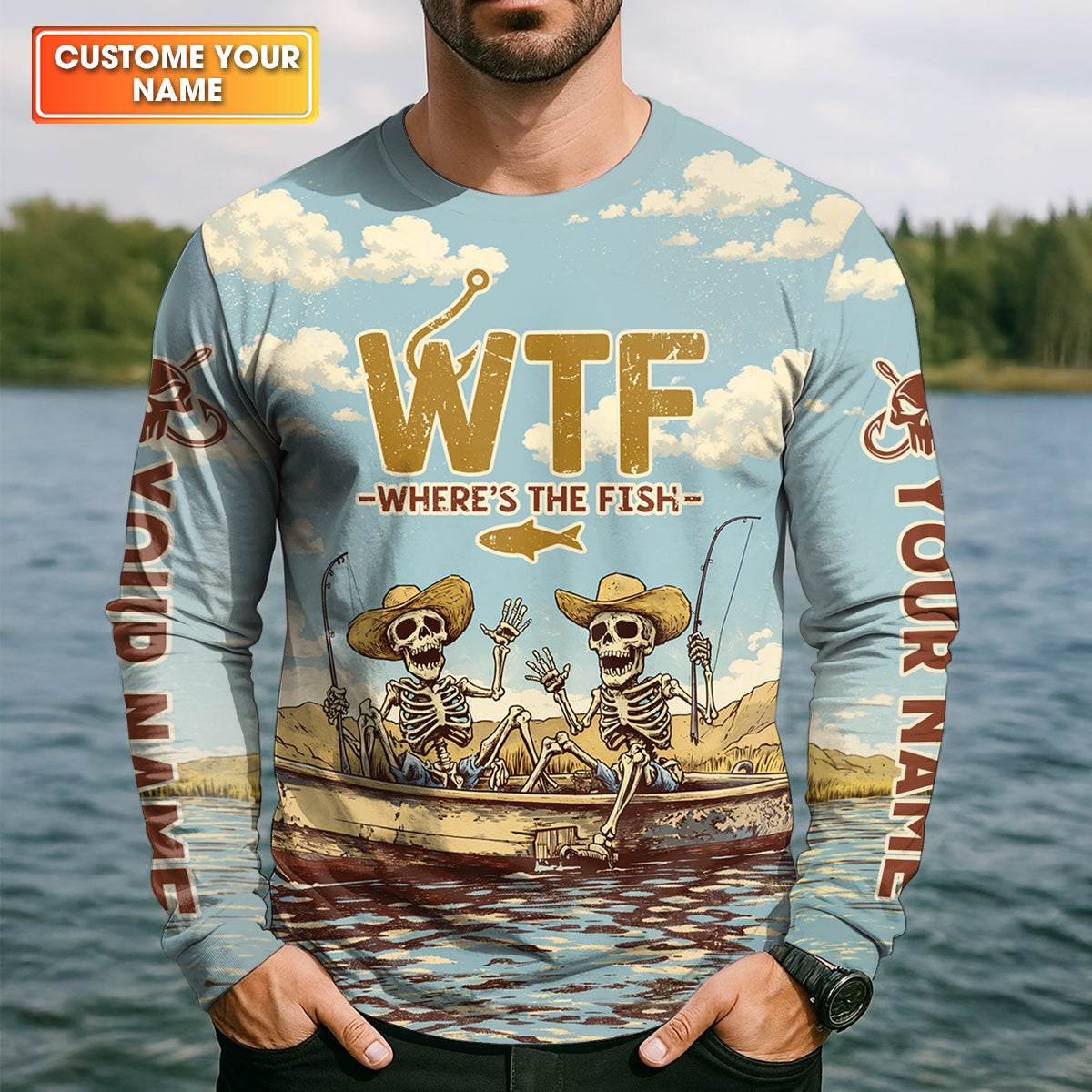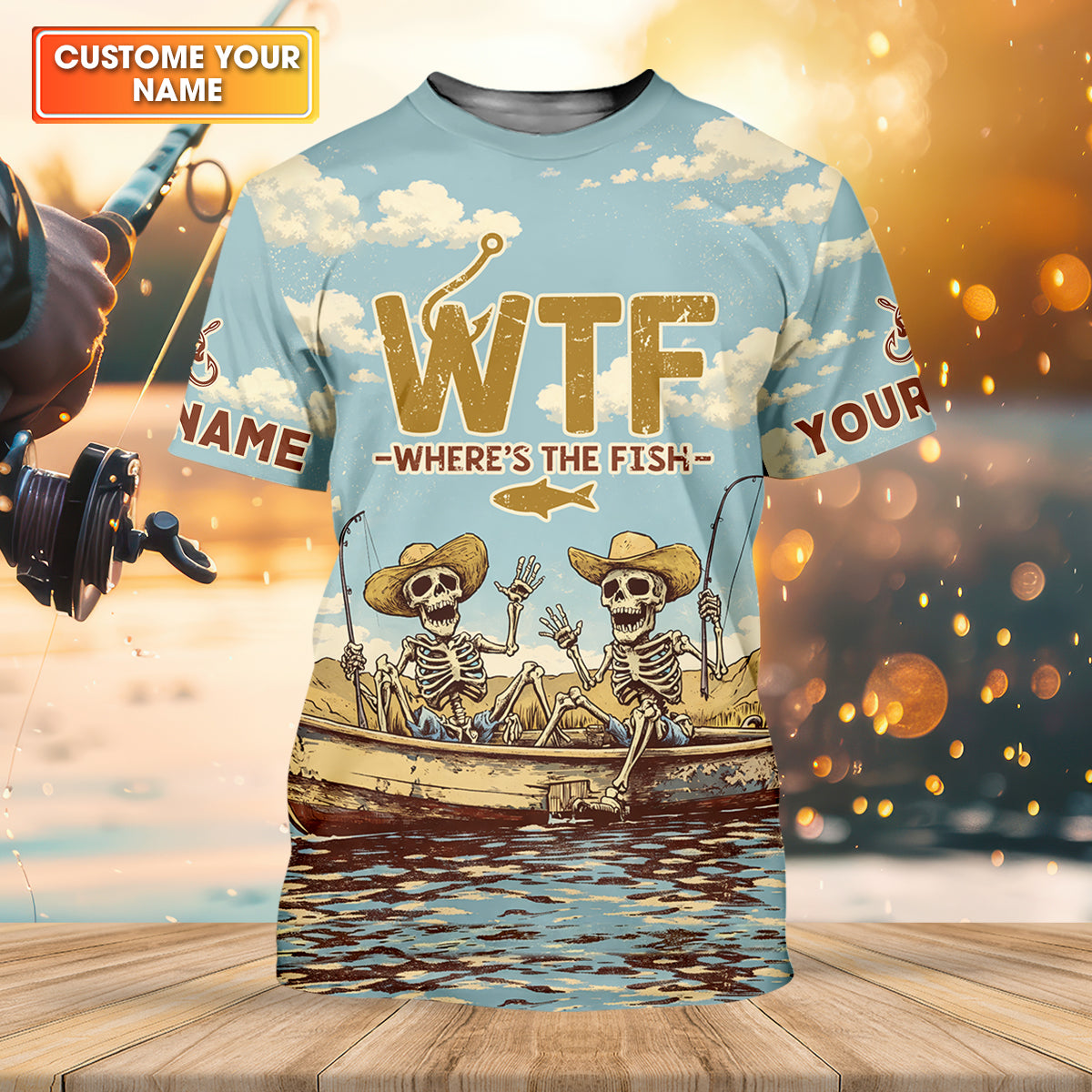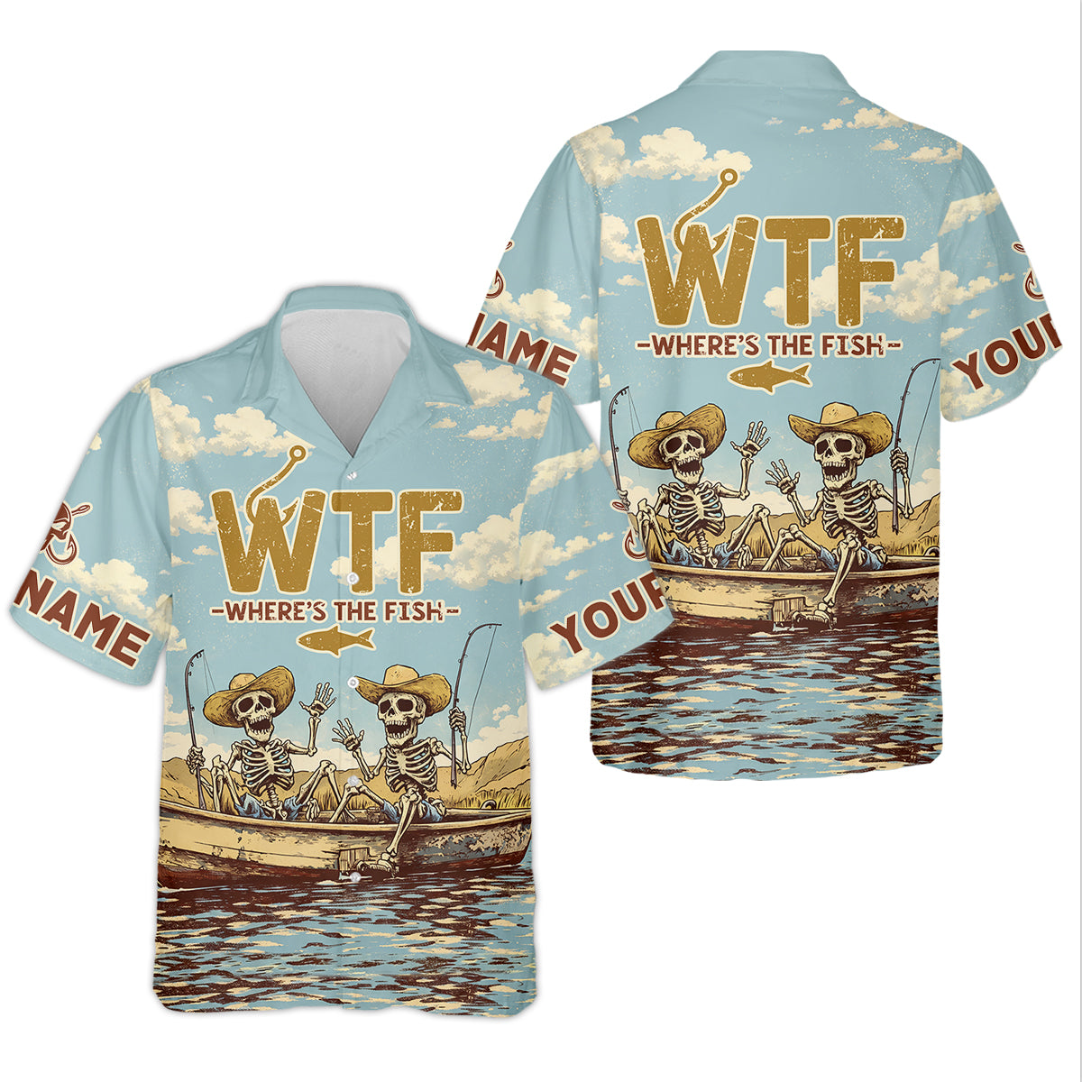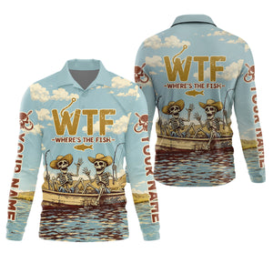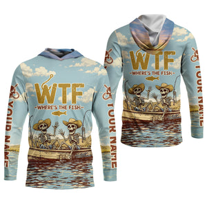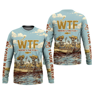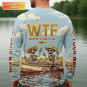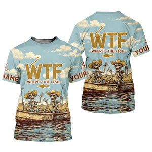 Personalized WTF Where’s The Fish Fishing Shirt, Funny Skeleton Fishermen Boat, Custom Name