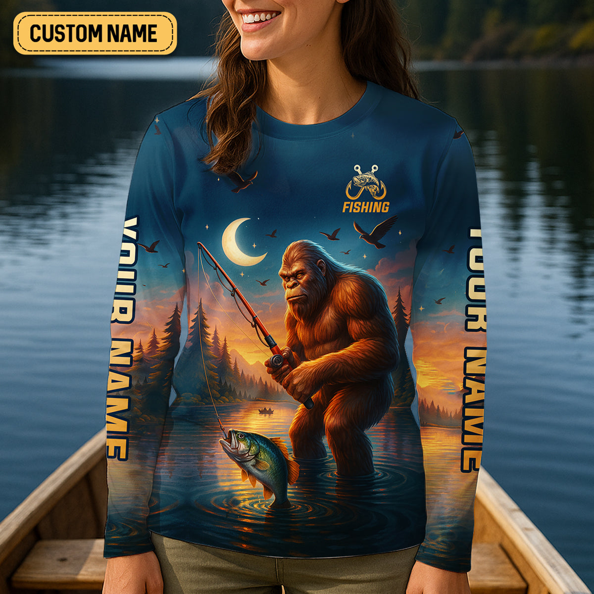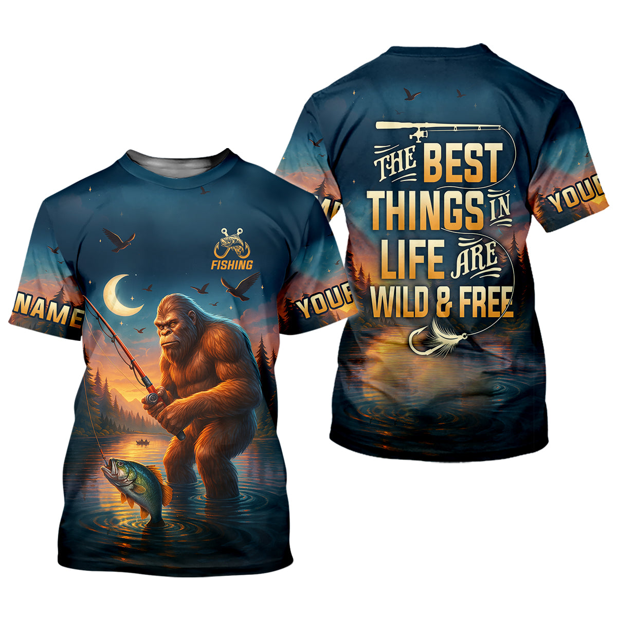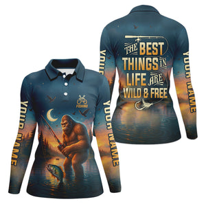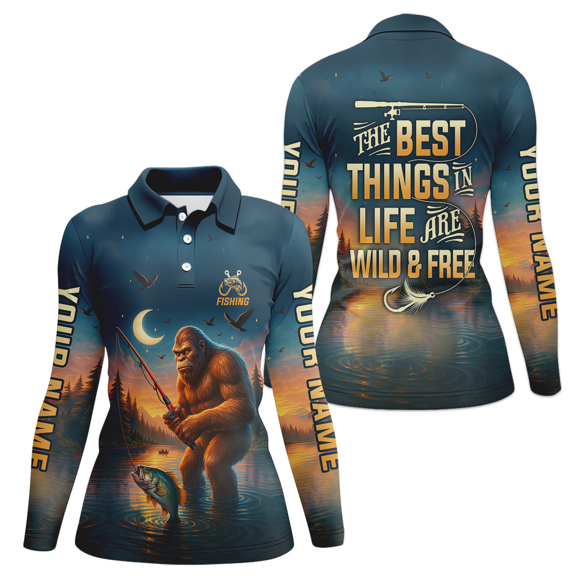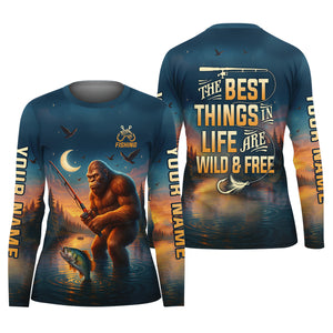 The Best Things In Life Are Wild And Free Funny Bigfoot Fishing Women SPF Shirt, Fishing Shirt For Women